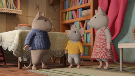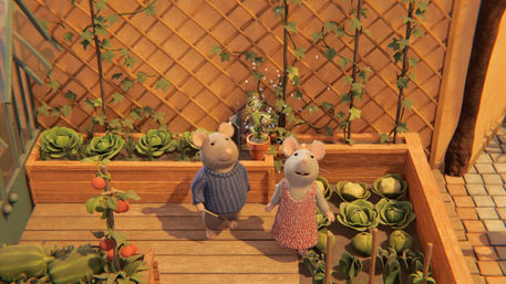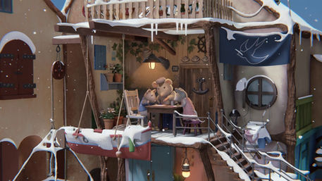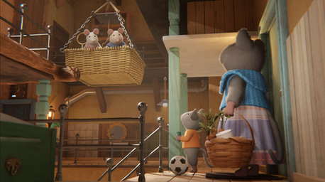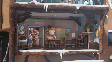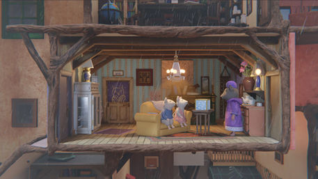 The apartments of the Mouse Mansion were open rooms with no fourth wall. So we used this configuration to make the sun shine inside and bounce all around the interior.